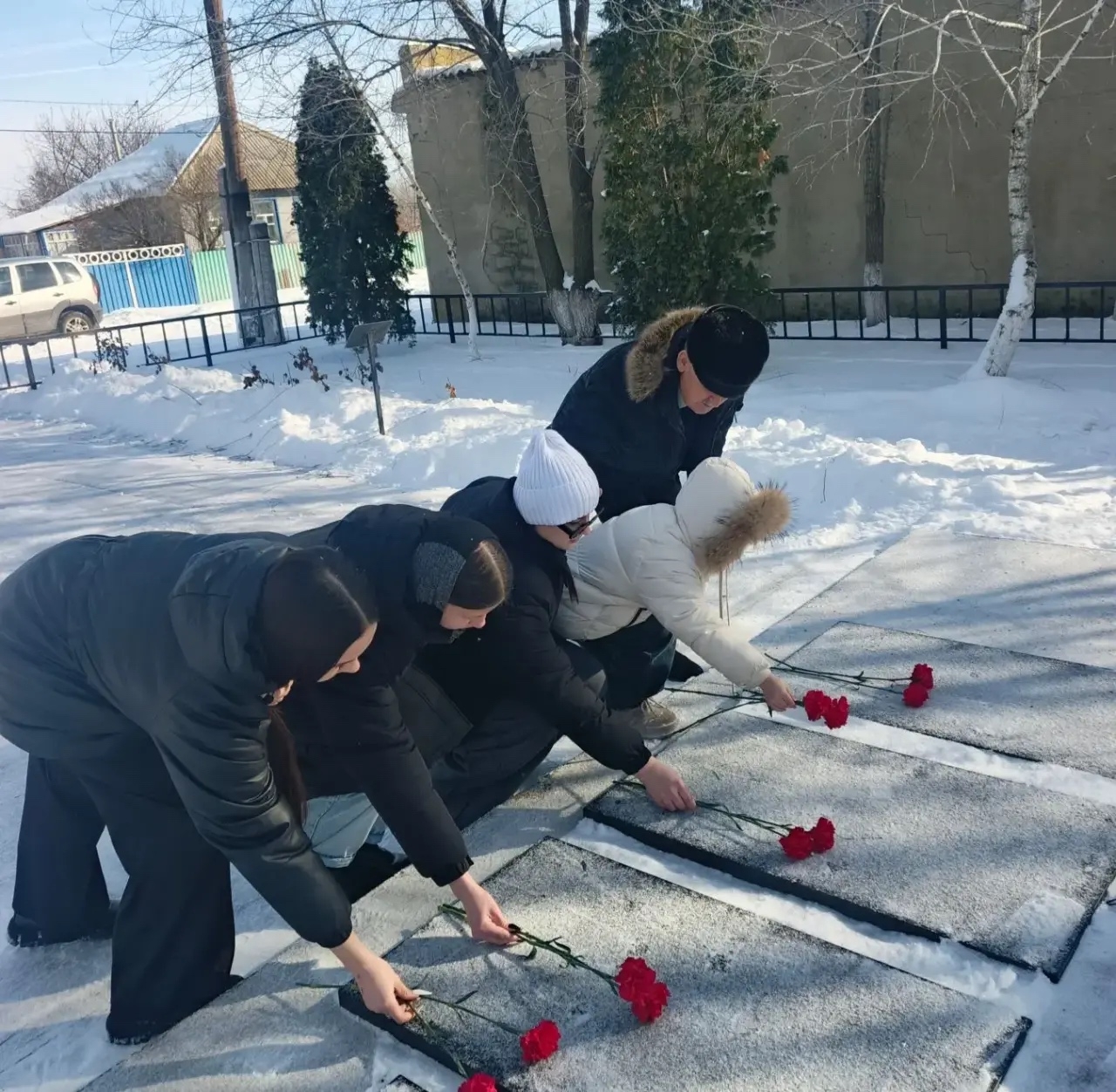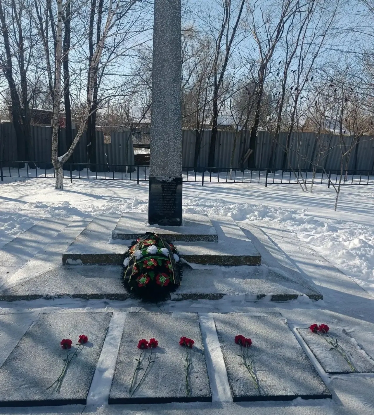 Глава администрации поселения Думбрава Н.И., специалисты МКУ «СКДЦСМ «Вдохновение» Горынцева Е.А. и Абрамчук А.А., а также добровольцы из волонтерского отряда «Юные пионеры» поднесли венок и цветы к Братской могиле.